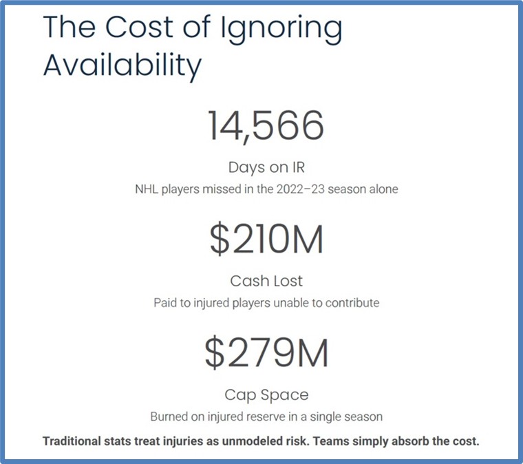 In the 2022-23 season alone, NHL players spent 14,566 days on injured reserve. That cost teams roughly $210 million in cash and $279 million in cap space. Traditional stats treat these injuries as unmodeled risks that a team simply must absorb.