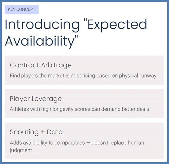 The goal isn’t to replace scouting. It is to add “expected availability” to the list of comparables used during negotiations. This allows teams to find contract arbitrage – opportunities where the market is mispricing a player’s physical runway – and empowers players to leverage longevity into contract value.